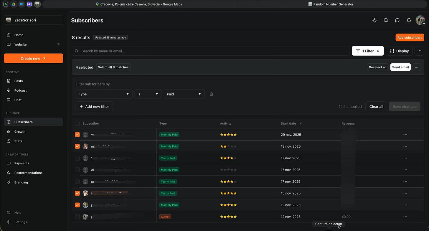 Am organizat o tombolă. Au participat exclusiv abonații premium, fără conturile gratuite și fără membri ai familiei. În final, au rămas patru cititori. Știu, nu e mult. Dar e un început onest, asumat și real.
